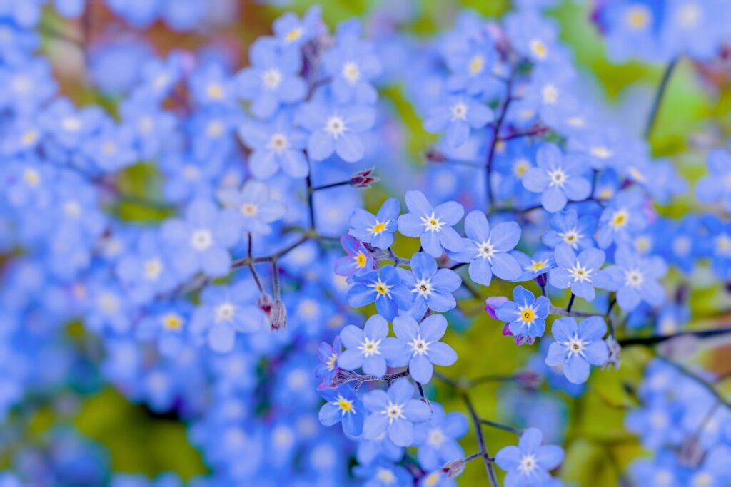 The blooms are usually bright sky blue with a small yellow or white center, creating a delicate and cheerful effect. Because of its fine stems, small leaves, and numerous tiny blue flowers, forget-me-not is easily recognized in ornamental plantings.